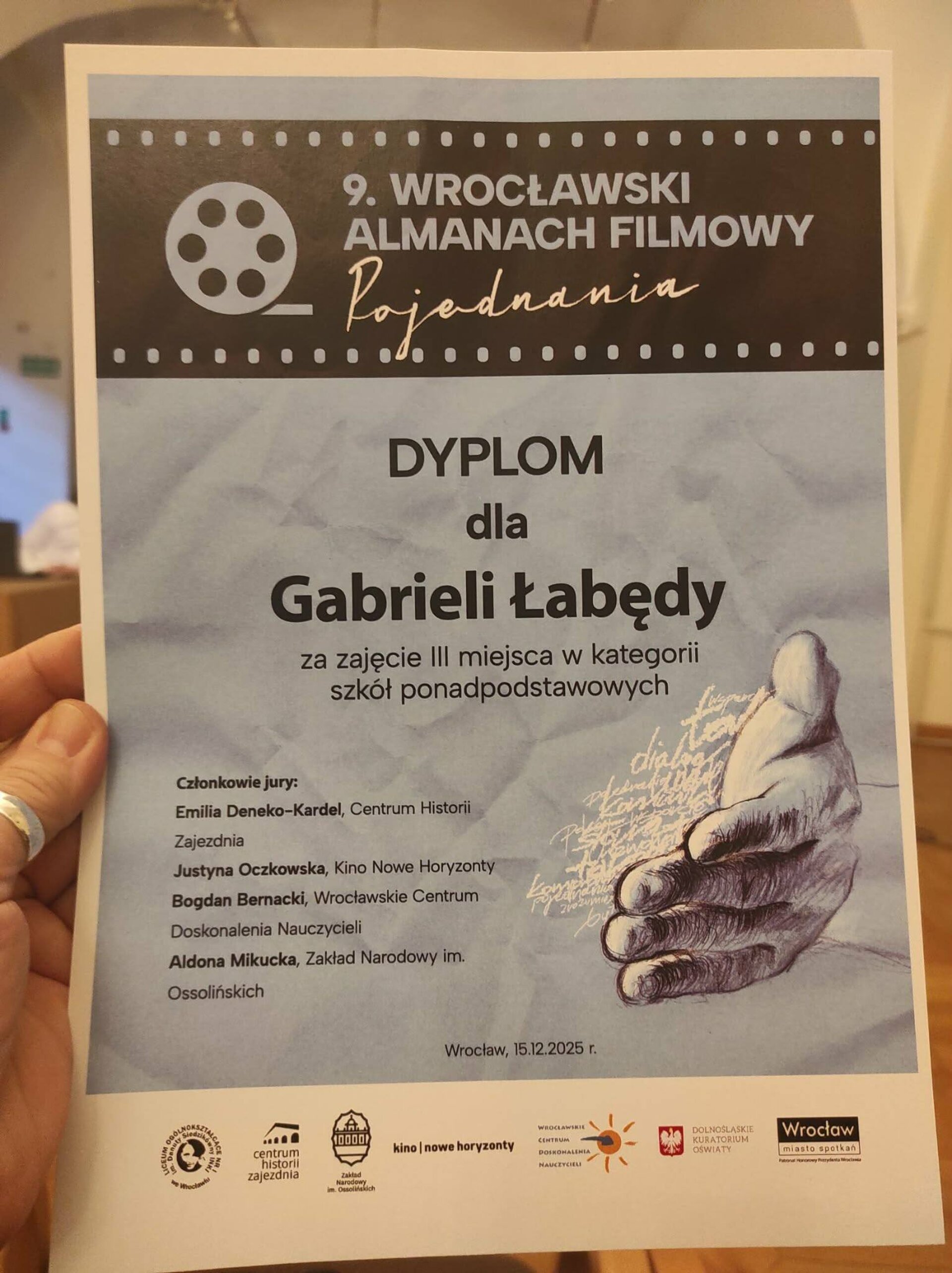 Na uroczystej gali w Zakładzie Narodowym im. Ossolińskich ogłoszono wyniki dolnośląskiego konkursu 9. Wrocławski Almanach Filmowy. Szóstkę reprezentowały dwa zespoły, które zrealizowały filmy dotyczące tegorocznego tematu konkursu – „Pojednania”: Iga Benda i Maksymilian Mendyka z kl. 3F oraz Gabriela Łabęda i Lena Bruchal z kl. 1C.