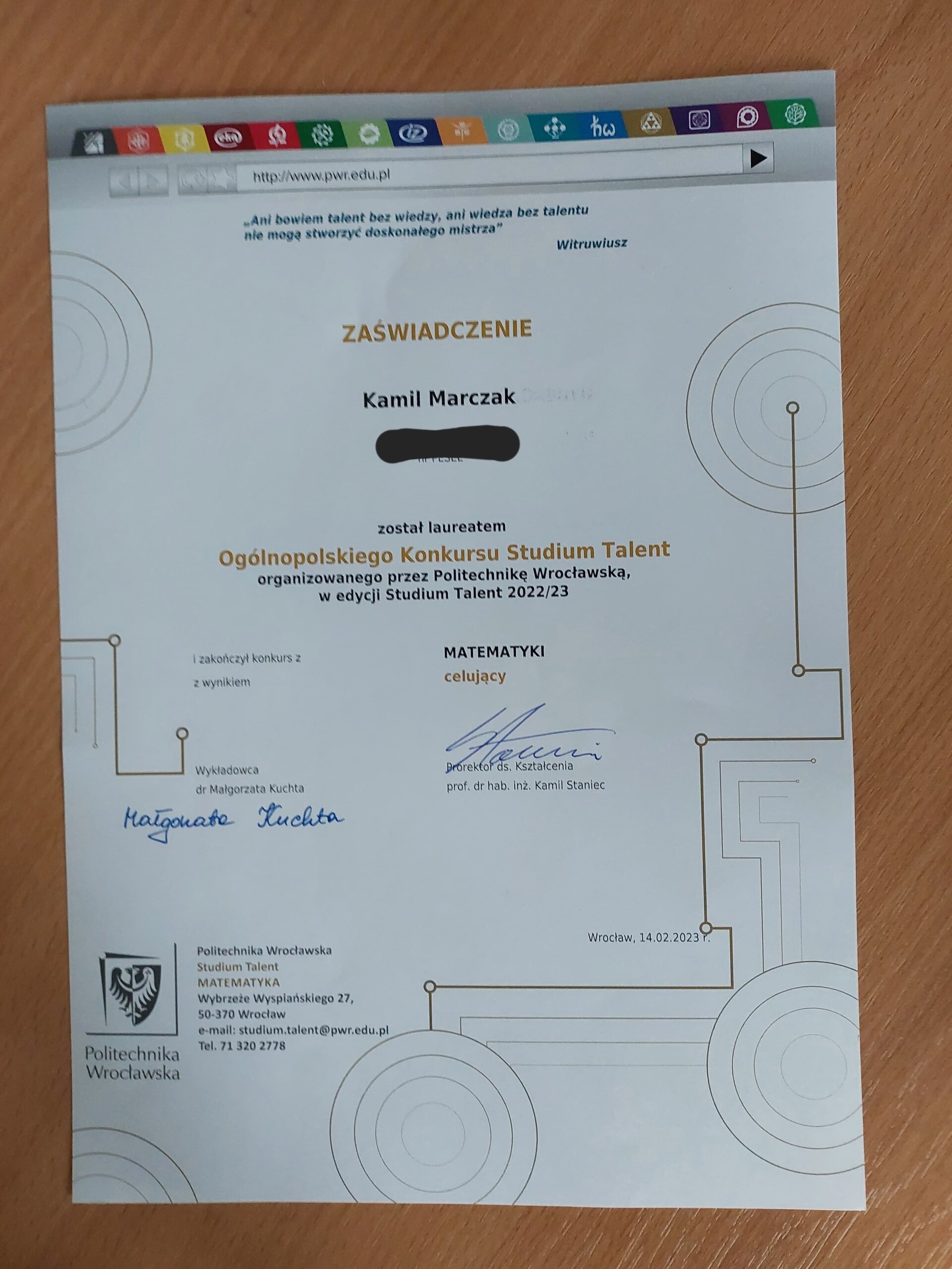 Z ogromną radością informujemy, że uczeń klasy 3b Kamil Marczak zdał egzamin na ocenę celującą i otrzymał indeks na dowolny wydział Politechniki Wrocławskiej.