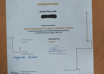 Uczniowie naszej szkoły wzięli udział w tegorocznej edycji kursu Studium Talent organizowanym przez Politechnikę Wrocławską. Kurs ten jest przeznaczony dla uzdolnionych uczniów dwóch ostatnich klas liceum. Studium Talent kończy się egzaminem, zaś uzyskana ocena przeliczana jest na dodatkowe punkty, które brane są pod uwagę przy rekrutacji na Politechnikę Wrocławską.